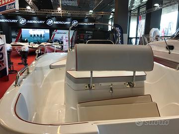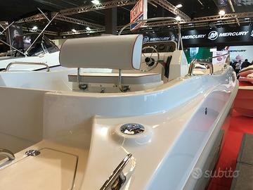 Contagiri, Consolle completa di tientibene e maniglia di appiglio in acciaio inox, volante in acciaio inox, telecomando monoleva, timoneria monocavo, parabrezza antiriflesso, vano portadocumenti a tenuta stagna, pannello elettrico con interruttori, sedile anteriore con cuscino più cuscino poggiaschiena; poggiapiedi pilota e copilota in acciaio inox, Vano sotto consolle per eventuale installazione WC con portello di accesso a compasso e oblò di areazione, Tasche laterali portaoggetti, Panca di poppa con gavone sottostante, Sedile di guida con schienale basculante per la guida seduta o semierettae comparto sottostante, Pulpito di prua acciaio inox,