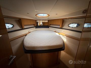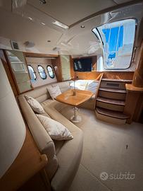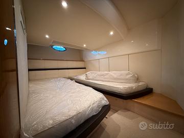 OTTIMO LAYOUT INTERNO, RIFINITURE DI ALTISSIMA QUALITA' PER ARREDI E MATERIALI, PARETI RIVESTITE IN ALCANTARA, LETTI CON RIFINITURE IN PELLE NAPPA COLOR CUOIO E DIVANO INTERNO IN PELLE NABUK. DUE COMODE CABINE CON BAGNO SEPARATO E DIVANO DINETTE TRASFORMABILE IN LETTO.
