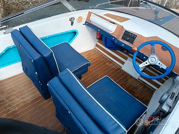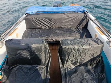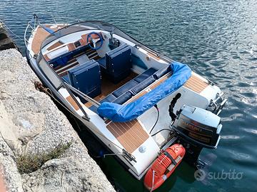 Motoscafo Acquaviva 495 sport/classic 5 posti con motore Suzuki 25cc anche per chi è senza patente. Pronta all'uso è dotata di sistema USB e carica 12v, interruttori di impostazioni di illuminazione (anche pozzetto interno di colore blu) sistema Bluetooth audio e rilevamento controllo potenza batteria. Rifornimento da tappo su scocca con sistema a tanica fissa e sensore di riempimento, pompa di sentina, tendalino e copri tendalino, copri sedili. Il prezzo comprende 2 giubbotti salvataggio bimbi, 1 adulto + borsa contenitore per dotazioni di bordo e telo di copertura provvisorio. Aggiungo motore identico a quello montato per eventuali pezzi di ricambio. No posto barca. No perdi tempo.