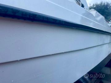 semicabinato Acquaviva Young, anno 1989, lunghezza 5,50 mt, larghezza 2,00 mt, pescaggio 0,50 mt, 2 posti letto a prua, persone imbarcabili max 6, potenza massima motore 140cv, lo scafo è stato completamente riverniciato esternamente e internamente, rifatta la linea di galleggiamento dal colore blu iniziale a nero, la barca ha già tutte le dotazioni di sicurezza, sentine, parabordi, luci,stacca batteria, contagiri,indicatore trim, megafono, quadro comandi e altri dispositivi nuovi mai utilizzati, monta panca pieghevole, gavone, tavolino estraibile e tendalino, varie ancore, mezzo marinaio, doppio serbatoio entrambi nuovi più un terzo di scorta, inoltre la batteria nuova, il motore è stato tagliandato, MOTORE MERCURY 25 ELPTO - TYPHOON 25/75 2 Tempi 1466 cc, motore depotenziato con certificato motorizzazione
