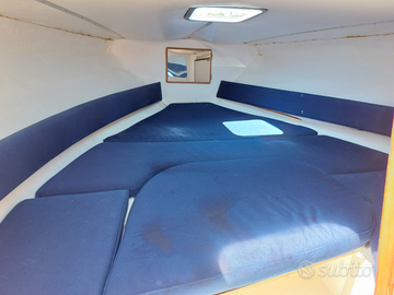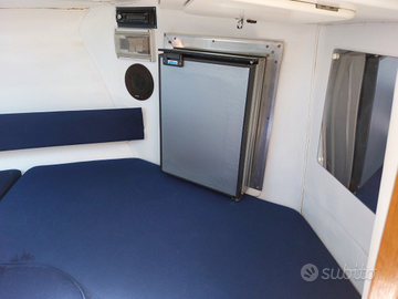 È dotata di una cabina con comoda cuscineria utile al pernottamento, oblò a tetto, frigorifero, radio e casse interne, faretti di cortesia.
