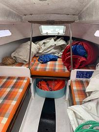 Piccola imbarcazione da crociera allestita per il campeggio nautico; ampio pozzetto con manovre rinviate; dotazioni di sicurezza entro un miglio, antivegetativa appena fatta armo completo in ottimo stato randa 2 Genova e spinnaker con Tangone. attualmente in secca è visibile presso il rimessaggio con possibilità di subentro del posto barca sia in secca che in acqua o in alternativa eventuale consegna da concordarsi.