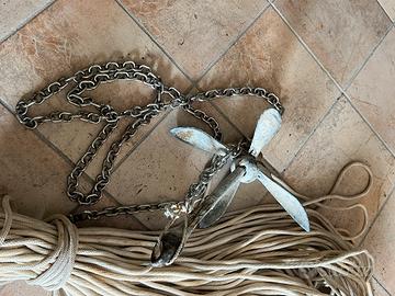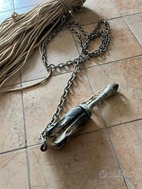 Vendo ancora a ombrello zincata da 4 kg con 2 metri di catena in acciaio inox e girella anti incaglio . L'ancora viene venduta con 130 metri di cima da 10 mm