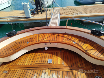 Installazione di nuovi carabottini sulla plancetta di poppa e sulla passerella. Riverniciatura e ripristino delle parti in mogano.