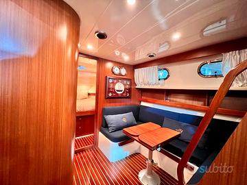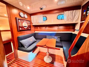 Il divano pranzo/relax è adeguato e all'occorenza è convertibile in cuccetta doppia,La cucina subito a sx entrando, seppur sottocoperta è a vista dal pozzetto ed è in realtà attigua e comunica con la parte esterna.