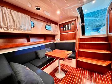 Il divano pranzo/relax è adeguato e all'occorenza è convertibile in cuccetta doppia,La cucina subito a sx entrando, seppur sottocoperta è a vista dal pozzetto ed è in realtà attigua e comunica con la parte esterna.
