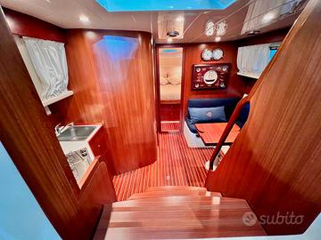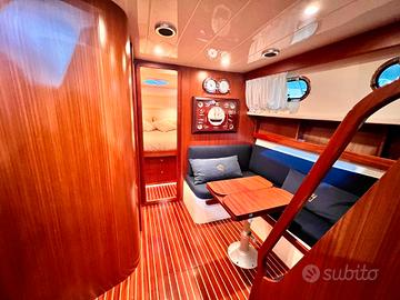 La scala di discesa è larga, (praticamente il doppio dello std.), e con comodi gardini. ,Il calpestio è di pregiatissimo parquet di legno, salone è molto ampio, la sensazione è di una imbarcazione di taglia maggiore.