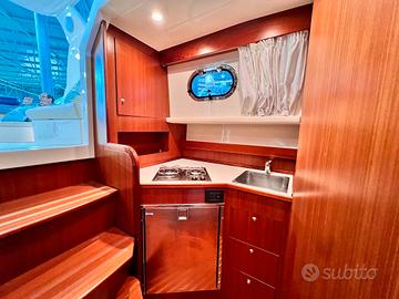 Il divano pranzo/relax è adeguato e all'occorenza è convertibile in cuccetta doppia,La cucina subito a sx entrando, seppur sottocoperta è a vista dal pozzetto ed è in realtà attigua e comunica con la parte esterna.