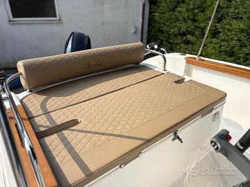 Cuscineria completa lux | Spalliera di poppa imbottita | Spalliera imbottita | Supporto seduta abbattibile 85 l | Consolle alta con guida centrale e porta accessorio | Parabrezza su consolle | Piede del tavolo | Tavolo | Tendalino | LED di cortesia