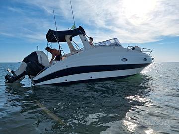 Vendo Aquamar 24 in buonissime condizioni. La barca misura 7.50 metri ed è del 2007 ma è stata completamente risistemata Aprile 2025, montata nuova strumentazione, rifatto impianto elettrico, carena, lucidatura intero scafo, sostituite N°2 batterie e tritatore acque nere. La barca è dotata di n° 2 cuccette ( Letto matrimoniale, letto una piazza e mezzo) frigo, fornello ad 1 fuoco, bagno con doccia locale separato, lavello esterno, doccia esterna, TV, luci complete compreso luci subacquee, tendalino chiusura campeggio con zanzariere, passerella in alluminio, tender Mt.2.30, serbatoio benzina 200L in acciaio, serbatoio acque nere, serbatoio acqua dolce, ampia spiaggetta. Motore Mariner 4t 225Cv con elica da 19 in acciaio completamente tagliandato ad Aprile 2025 con 340 ore di moto, motore ausiliario 5cv Mercury da tiro nuovo mai messo in moto comprato ad Aprile 2025.