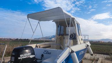 Vendo barca dei cantieri Astra, motorizzata Suzuki DF 115 4 tempi (anno 2008). Barca in ottime condizioni, curata e pronta per la stagione. Dimensioni: Lunghezza: 6,38 m Larghezza: 2,30 m Lavori e manutenzione recenti: Cuscineria interna e parte dell'esterna rifatte a giugno 2025 La rimanente cuscineria esterna in buone condizioni Impianto elettrico completamente rifatto Illuminazione LED (navigazione, sottoplancetta e cabina) 2 batterie da 80 Ah nuove (2024) Dotazioni e comfort: Ampio tendalino agganciato alla cabina: copre tutta la poppa e può restare aperto anche in navigazione Cucinino a un fuoco sotto il poggia reni Dotazioni di sicurezza complete Ecoscandaglio Lowrance GPS cartografico Interphase 2 porta canne Barca comoda, affidabile e pronta all'uso. Ideale per gite giornaliere, brevi crociere in famiglia e la pesca Visibile su richiesta Prezzo: 15000