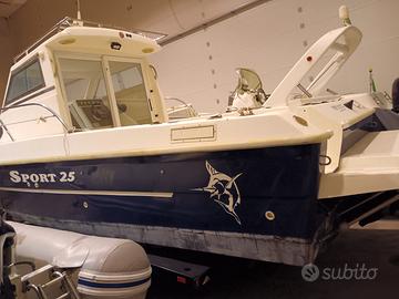 Vendo per mancanza di posto Barca Cantiere Astra, Sport 25, tutta in ordine, motore 4.3 Mercruiser v6 tagliandato a ottobre, completa di cuscineria interna ed esterna in ottime condizioni, cucina, frigo e lavello, bagno. impianto elettrico in ordine. si cede completa di ecoscandaglio Garmin motore ausiliario Suzuki 20cv con 40 ore di moto, completo di manetta e cavi. No affaristi