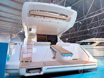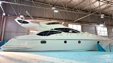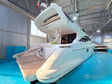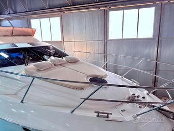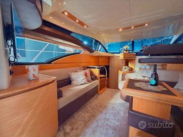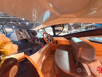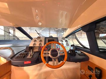 Anno 2006 n. 2 motori cummins da 425 Lucidatura scafo marzo 2026 – Versione 2 cabine + divano letto trasformabile, due bagni eleganti e con box doccia maxi. Il salone, con ampie vetrate panoramiche, include una zona pranzo- relax con maxi divano a L a dx, che all’occorrenza si trasforma in letto matrimoniale. Contrapposto a sx un divanetto di cortesia. Più avanti a dx, la strepitosa e moderna, plancia di comando, (in piano rialzato). In piano ammezzato a sx la cucina, nel disimpegno antistante la zona notte, ergonomicamente ampia e ben attrezzata. La cabina armatoriale a prua dispone di letto matrimoniale e bagno privato con maxi box doccia. La cabina ospiti a dx offre due letti singoli e accesso diretto al secondo bagno, con box doccia. Comandi motori elettronici, Monitor dei consumi (Cummins), 2 Display Plotter con antenna GPS (Raymarine E 80 Multifunzione in plancia interna e sul Fly) Multifunzione: Cartografico, Radar. Ecoscandaglio (Tridata Raymarine Eco-Log-Temp. acqua), Pilota automatico (Raymarine St 60), Contametri catena (Quick), 2 Radio VHF (Garmin cornette in plancia e fly), Flaps con Indicatori, Elica di poppa, Elica di prua. Passerella idraulica • Piattaforma (di poppa con calpestio in teak). • Pozzetto e scala di risalita al fly in teak. • Tavolo nel pozzetto a scomparsa. • Tavolo fisso su fly in legno. • Salpa Ancore Elettrico a prua con winch di tonneggio. • Presa acqua banchina. Aria condizionata, Clima reversibile (Estate ed inverno),regolabile in tutti i locali,Cucina Interna ben accessoriata, con piano cottura in vetroceramica, Microonde,Frigorifero e un congelatore,1 Frigorifero a cassetto sul fly, Impianto acque nere a depressione, 2 WC marino elettrico (Sealand a depressione). Digitale Terrestre, 1 Tv in salone, Radio AM/FM, con altoparlanti interni ed esterni. TAPEZZERIE Bimini,Copripozzetto, teli copri finestra, Telo Copertura Fly, Tappezzerie interne in ordine e in parte ricondizionate.
