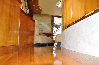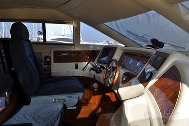 Descrizione Interni 3 CABINE: 1 CABINA ARMATORIALE MATRIMONIALE A PRUA, 1 CABINA VIP CON LETTO MATRIMONIALE, 1 CABINA OSPITI CON LETTI IN PIANO, 3 BAGNI DOTATI DI LAVABO, WC ELETTRICO E BOX DOCCIA.CUCINA COMPOSTA DA PIANO COTTURA IN VETROCERAMICA A 3 FUOCHI, LAVANDINO E FRIGORIFERO.AMPIA ED ACCOGLIENTE SALONE CON TAVOLO DA PRANZO E ZONA DINETTE CON DIVANO.CABINA EQUIPAGGIO A POPPA CON PROPRIO SERVIZIO. Descrizione Armamenti POZZETTO E PLANCETTA IN TEAK, PASSERELLA IDRAULICA, ELICA DI PRUA, TENDALINO BIMINI TOP SUL FLY, TENDALINO POZZETTO, CUSCINERIA ESTERNA COMPLETA, VERRICELLO DI TONNEGGIO IN POZZETTO, SECONDO FRIGORIFERO, PAVIMENTAZIONE SALONE IN LEGNO, TELO COPRICONSOLLE FLY. Descrizione Strumentazione VHF, GPS CARTOGRAFICO RAYMARINE (IN PLANCIA INTERNA E SUL FLY), RADAR, PILOTA AUTOMATICO, LOG, CONTAMETRI CATENA, TV LCD IN SALONE, ANTENNA TV, STEREO.