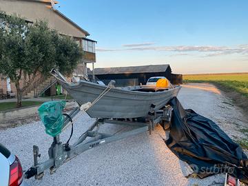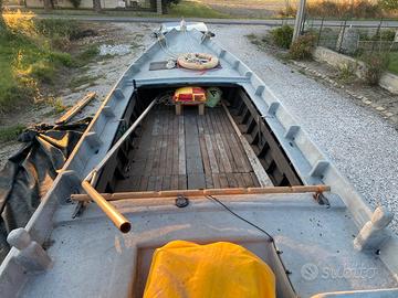 Vendo per inutilizzo barca a fondo piatto lunga 6 metri per una larghezza di 1,65m, vendo separatamente anche motore yamaha 2 tempi 25J e il carrello con libretto e porta targa con luci, peró senza freni.