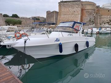 Vendo, per scarso utilizzo, barca a motore cantieri Petrachi MT. 7,30 W A costruzione settembre 2021 con 2 motori fuoribordo Mercury da 150 CV 2021 con 65 ore di moto in 5 anni, tagliandata Mercury due volte l'anno, praticamente nuovi. Completa di cuscineria interna ed esterna, coperture a tenda, ecoscandaglio completo di cartografia, radio. 2+2 posti letto e bagno centrale. Completa di carrello 2 assi Satellite mai messo in acqua.