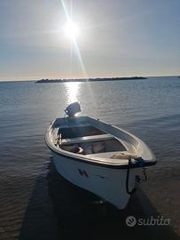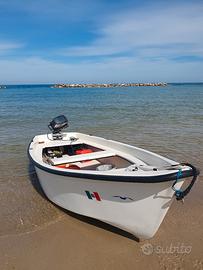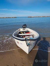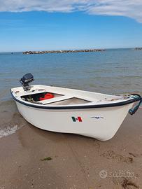 Conero 410 con fuoribordo Yamaha 8 CV gambo lungo completo di serbatoio originale Yamaha lt. 20. Alla barca con motore aggiungo: 1) kit navigazione e soccorso entro tre miglia (tranne estintore e razzi); 2) 6 nasse nuove per la pesca alle seppie e polpi; 3) 6 segnali utili per stendere in mare le nasse completi di bandiera; 4) cordame necessario per la pesca; 5) coppia di remi; 6) 6 ancora di medie/grandi dimensioni utili per la pesca da posta ed altra attrezzatura da pesca. 7) 3 rulli alaggio. La barca è in buone condizioni ed è perfetta per la pesca sottocosta. È presente presso un'area rimessaggio privata sedente a Porto d'Ascoli. N.B.: il fuoribordo è completo di documenti con assicurazione pagata fino al 5 maggio p v.