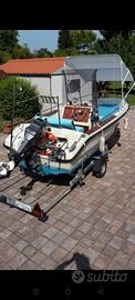 vendo barca a motore omologata per 5 persone, carrello revisionato gomme nuove impianto elettrico nuovo, barca con motore Yamaha 25/50 due tempi dotazioni di bordo complete, cuscineria rifatta.