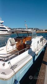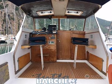 Barca a motore anni settanta, bello stile vintage, molto vivibile sia all'interno che all'esterno, cabina con potenziali 4 posti letto, ampio tavolo cucinino e bagno, grande pozzetto con tendalino, tavolo a scomparsa, panchetta, comoda spiaggetta e prendisole.