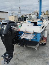 Vendo barca a motore fuoribordo. Lunghezza 5 metri, ben tenuta e curata, priva di difetti, ruggine o danni. Tutti i pezzi in acciaio sono cromati e l'attrezzatura ben tenuta. Completo di kit dotazioni di bordo entro 12 miglia. Motore Mercury F 40 ELPT EFI, benzina, 4 tempi, anno 6/2022, usato pochissimo (praticamente come nuovo). Si può guidare senza patente.