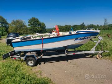 Barca m.4.50. Tendalino.Pilotina.Cuscini.Motore Suzuki fd40 4 tempi con trimmer. Solo acqua dolce e usata 15 GG all'anno e poi in rimessa. Carrello con regolare libretto