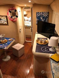 Cabina armatoriale a prua, cabina matrimoniale a poppa, dinette trasformabile, cucina lato dritta, locale wc con doccia ( acqua calda )sul lato sx. Strumentazione e dotazioni di bordo: GPS, VHF, elica di prua, passerella idraulica con telecomando, impianto hi-fi con cd, antenna tv. Dotazione armamento: Tender Plancetta di poppa allungata, 2 frigoriferi , gruppo elettrogeno, boiler, tendalini nuovi ( chiusura invernale completa )