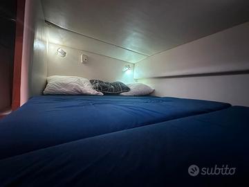 Quattro posti letto, bagno con doccia acqua calda e fredda, serbatoio acque nere, cucina con due fuochi a gas con termocoppia, frigorifero 220 e 12 V, microonde. Boiler funzionante a 220 volt caricabatterie con cavo di banchina e impianto fotovoltaico. Due pompe di sentina un elettrica e una manuale.