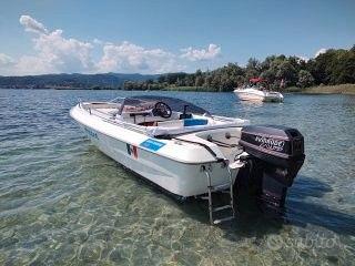 Vendo bella barca di mt. 4,80 accessoriata in perfetto stato con motore Evinrude 737 usata solo Lago Maggiore come da foto. cel. 3343102262 telo copertura totale tendalino parasole elica nuova pronta in acqua.
