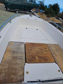 Vendesi barca aperta A Punzio dei primi anni 90 lunga 5 metri e 80cm,composta da tre strati di vetroresina, di salvagenti,parabordi,cuscini(questi ultimi nuovi),tavolino.Può ospitare fino a sette persone. Il motore Yamaha 40,ha circa 10 ore di navigazione.