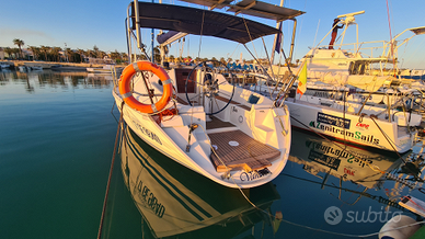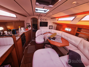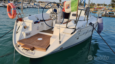 Jeanneau Sun Odyssey 36 dislocamento 9450 kg bandiera Italiana del 93 tre cabine, due bagni in ottime condizioni generali, oltre lavandino camera di prua, lunghezza 10,77 per un baglio massimo di 3,77 con spazi interni inaspettati per un 36, tuga alta imbarcazione sottocoperta molto luminosa parecchi lavori effettuati nel tempo per mantenere e migliorare la vivibilità a bordo utilizzata per lo più nel periodo di ferie estivo. Motore yanmar 3gm30 linea asse ripassato per pignoleria in officina autorizzata nel 2020 attualmente a circa 600 ore, oltre al tagliando annuale eseguo pulizia di scambiatore e collettore di scarico, elica tre pale fisse della Sonica calcolata per avere la migliore performance a motore circa 7,3 nodi a chiglia pulita e circa 6,2 di media a 2.200 giri, oltre a elica radice a due pale di rispetto, pilota automatico, stazione del vento, strumento lowrance élite 9 con trasduttore 3 in uno, poppa aperta con pedana in okumè con la possibilità di riportarla originale, boiler nautico acqua calda, pannelli solari 300 watt con regolatore di carica mppt, tre batterie da 100 amp per i servizi e una da 80 per motore, per l'intrattenimento due TV una smart in dinette e una convenzionale in camera di prua, impianto audio con amplificatore da 1000 watt sorgente digitale smart diffusori sonori in dinette due satelliti Indiana Line completato da due sub da 16 cm , in esterno due casse nautiche boss in pozzetto.