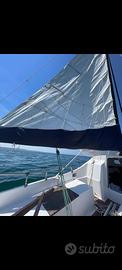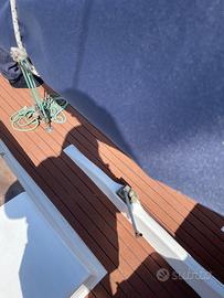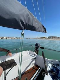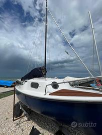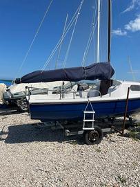Barca a vela 5,5m modello Capitan Cook del cantiere Tripesce, deriva mobile, carrello in ferro zincato con ruote stradali e argano a nastro, cabina spaziosa con 2 posti letto e spazi di contenimento, motore 4cv 4t selva goldfish, randa fiocco e spinnaker, rollafiocco inox, teak sintetico, ancora danforth zincata, tutte le dotazioni di sicurezza per le 3 miglia, rinnovata e pronta all'uso .
