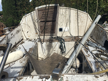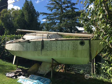 Vendesi barca a vela in legno con cabina con bagno 4 cuccette cucino per veri amatori lunghezza 6.50 largh 2.5 pescaggio 2,0 albero e boma deriva fissa in acciaio scafo in legno marino 3 Winch doppia randa fiocco genoa invaso su misura senza ruote. Costruzione cantiere di Genova. Ha navigato nel Neditaraneo . Ferma da diversi anni. Necessario camion con gru per trasporto. Spese a carico del compratore. 2000? trattabili.