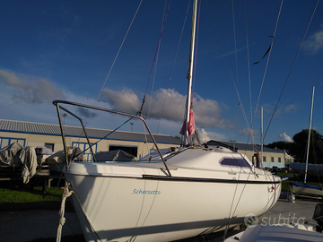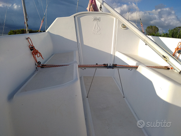 Imbarcazione Carrellabe Nautivela Scherzo-classe Micro, lunghezza fuori tutto 5.5 MT, 5,17 al galleggiamento- 2.38 di larghezza, deriva mobile a completa scomparsa. Deriva a baionetta, zavorrata di 145 kg, rinviati in pozzetto e issabile a mano. Peso imbarcazione 500 kg, pescaggio MT 0.15/1.10, particolarmente adatta ai bassi fondali (si comporta molto bene anche con la deriva parzialmente retratta). Superficie velica 18.5 mq, 4 cuccette. Imbarcazione prodotta tra 1980/85, matricola n.32.