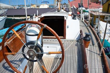 lft 10.65 largh. 2,75 Disl. 7 ton. Chiglia lunga. Costruzione Lamellare di mogano. Albero e boma in Duglas perfetti. Interni in legno. Due ampie cuccette in dinette, Tavolo ripiegabile. Due cuccette a V a prua. Tavolo da carteggio cucina, WC manuale con doccia.