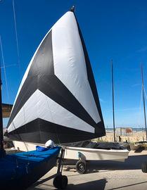 24 (è disponibile anche l' albero originale ) con randa steccata e aggiunto un pombresso sempre in carbonio per un gennaker dedicato.Anche la barra del timone è stata realizzata in carbonio e la pala del timone è basculante per permettere alaggio e approdo in spiaggia.Con carrello acciaio inox.il tutto a € 3500 regalata .,!