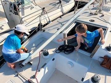 Coperta solida, impianto elettrico, giro di vele da crociera, randa, spi e genoa in dacron.