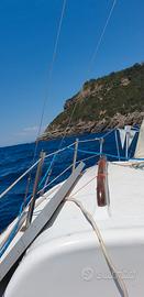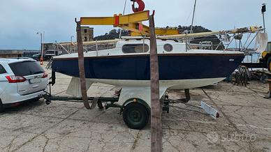 leisure 17 con vele (randa, fiocco e genoa) in sufficiente stato. La barca è del 1969, con carrello originale immatricolato in Italia e collaudato. Impianto elettrico funzionante con batteria e pannello solare con regolazione di carica. Serbatoio dell'acqua con doccetta in pozzetto. Motore fuoribordo 6 CV 4 tempi in ottimo stato. Il Leisure 17 è la più piccola barca di serie che abbia attraversato l'Atlantico. Vendo per passaggio a barca più grande. Visibile a Pozzuoli. Una nota: nella foto con il carrello il gruppo ottico tocca terra perché avevo rimosso la cima che lo tiene alzato fissandolo alla barca. Quando il carrello è senza barca, le prolunghe vengono smontate.