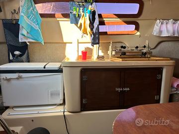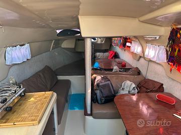 Internamente è un "open space" alto 1,85 m, molto luminoso, con una doppia cuccetta a prua ed a poppa, più 2 cuccette centrali, wc manuale separato (pompa cambiata quest'anno), fornello a 2 fuochi, e tavolo (amovibile).