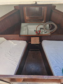 Pozzetto centrale, 6 cuccette, cabina di poppa con lavello indipendente. Cabina di prua con lavello e wc. Motore Perkins 90 HP in buone condizioni. Cucina completa di doppio lavello, 2 fuochi a gas, forno, frigo e dotata di tutte le stoviglie. Dotata di boliler x acqua calda ,secondo rubinetto sul lavello cucina x acqua di mare, split aria calda