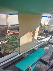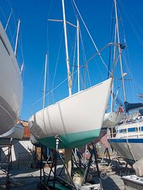 interni modificati per ricavare un bagno decente, la barca ha la chiglia rifatta in inox, le murate verniciate in abf, sotto il trattamento anti osmosi, senza traccia di osmosi, passa scafi rimessi con valvola, interni rifatti e non conclusi con multistrato marino e iroco massello, qualcosa di estetica come spalle gavoni, in frassino, la barca presenta le vele da regata tenute maniacalmente, e il set originale di vele come nuove anche quelle, coperta riverniciata con antiscivolo sempre abf con polimero per antiscivolo, la barca presenta diversi lavori per concludere ma parte anti vegetativa e rimontaggio degli ultimi pezzi sulla coperta può andare in acqua. tutti i pezzi sono presenti per il rimontaggio. Navigatore naviman 6500, doppia batteria servizi e motore, differenziale batterie ecc, al livello elettrico da fare gli attacchi e qualcosa l'ho fatto già cominciare e sarebbe da montare o modificare.