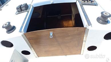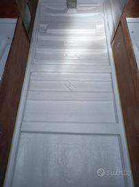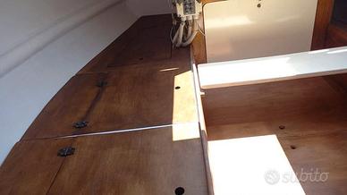 Vendo barca a vela da regata modello Ziggurat da 8,12 metri, appena finito restauro. Mutare ridipinte con bicomponente blu su fondo epossidico. Coperta con parti in bicomponete bianco e zone di passaggio con interdek. Interni rimessi a nuovo, ridipinti e con applicazione di flatting protettivo. Tutte le parti in resina ridipinte con gelcoat. Fondo resinato e ridipinto. Paiolo rifatto in legno Okoumé con pannelli occhiellati per ispezione del fondo Purtroppo come foto in acqua ho solo quella che ho messo, ma come si può vedere anche dalla foto della poppa alcuni colori sono cambiati. Poppa e murate blu, fascia grigia e primo strato di antivegetativo applicato color beige. Vele in ottimo stato, fiocco ottimo, secondo fiocco accettabile, genoa molto buono, la randa ottima, necessita di qualche cucitura lungo un bordo Invaso universale 600 euro