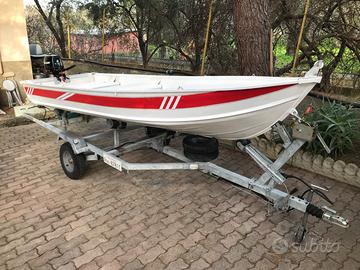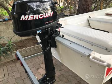 Barca in alluminio del peso circa 90kg lunga 4,20x1.30x70 completa di carrello omologato e motore 4cv mercuri con relativo libretto