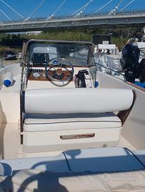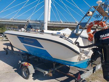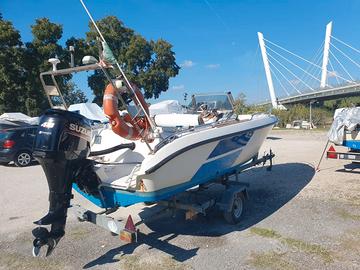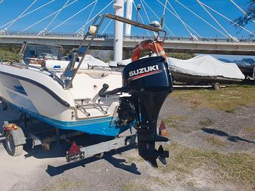 imbarcazione Angelo Molinari open, lunghezza m.5,45in ottime condizioni, motore 4 tempi hp 40/70 come nuovo, circa 400 ore. Dotazione di bordo completa entro le 12 miglia con zattera per 4 persone. Strumentazione di bordo: GPS, ecoscandaglio garmin,bussola, radio VHF. Accessori: 2 batterie, pompa di sentina, pompa presa a mare, 5 portacanna da pesca, di cui uno montato sulla murata, girevole e basculante per pesca al tonno. Carrello non omologato. Prezzo 6500 trattabile. Info : Gino 330 600034.