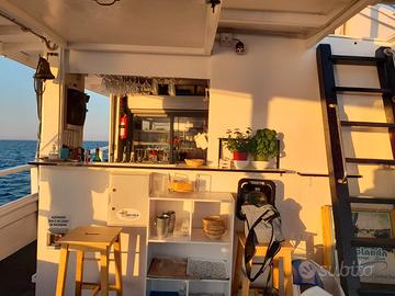 Cucina totalmente attrezzata con: n.2 frigo (vetrina bevande e frigo alimenti), lavabicchieri, lavello, piano cottura con 4 fuochi e cappa aspirante, forno a gas da incasso (l'impianto è a norma e abbiamo anche il certificato di conformità), vari ripiani, divisore verticale cucina dal reparto bar, passavivande, lavello bar, ripiano bar, freezer per ghiaccio, vari ripiani ...