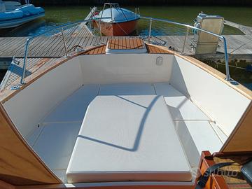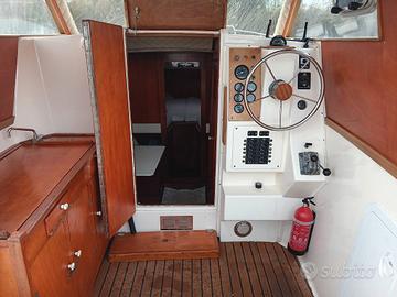 Barca 7.50 metri piu plancetta. con motore Janmar 140 td intercooler in linea d'asse con 1282 ore , motore robusto e silenzioso in perfette condizioni . Specchio di poppa allargato per stabilizzare il rollio di navigazione e all'ancora . All'interno troviamo cabina di prua matrimoniale molto comoda, più dinette trasformabile in letto singolo ,bagno separato con lavello e wc elettrico . mobile cucina esterna accanto alla guida con 2 fuochi e lavello sotto al mobile c'è la cassettiera , gavoni contenitori sotto il letto di prua e sotto dinette .salpancora elettrico con doppi comandi a prua e consolle di guida .