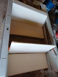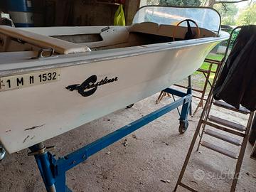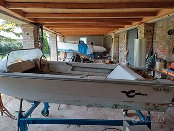 Vendo piccolo cacciapesca della Crestline , cantiere americano, lunghezza 4,10m, largo 1,45m. Ha passato gli ultimi 25anni in un garage di lignano sotto un mucchio di roba. Carena al Gelcoat zero sorprese, sedute nuove, come da foto lo schienale guidatore si abbatte e diventa un grande prendi sole. Io sono 185cm e mi avanza. Diversi lavori da fare , il parabrezza è solo appoggiato secondo me da sostituire . Si trova a udine . Posso consegnare con trattamento antiosmotico preventivo e 2 mani di antivegetativa. Basta mettersi d'accordo. Posso consegnare con carrello stradale.