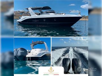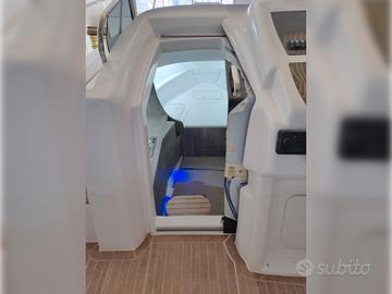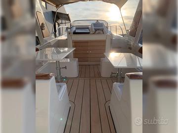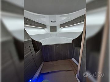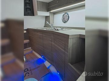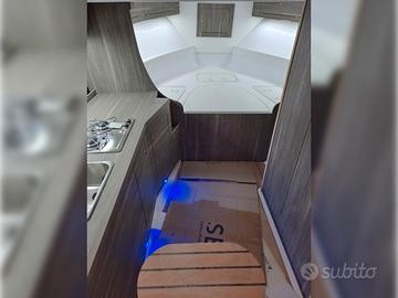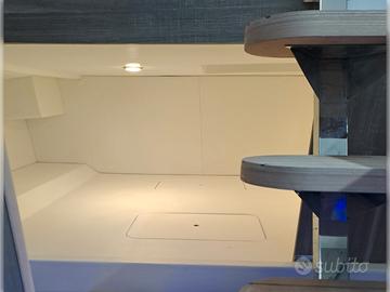 Doppi i divani con annessi tavoli di poppa trasformabili in prendisole e motorizzabile a scelta sia con fuoribordo che entrofuoribordo.