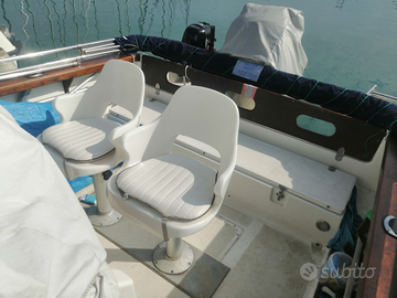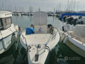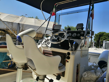 Capelli 6,80 MT. Con 150 CV. Mercury 4 t. Con 320 ore di moto con 5 CV Mercury nuovo usato 2 volte x traina , 2 eco, GPS, bussola,doccia, radio,4 porta canne , salpa ancora elettrica, imbottitura completa, consolle Centrale con copertura,gavone di prua enorme, 2 poltroncine girevoli, parasole a sei archi in acciaio....full