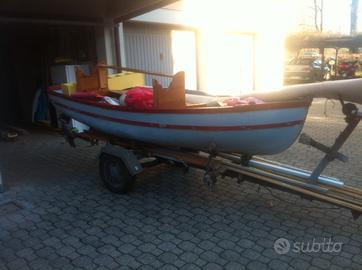 barca legno e resina, buono stato - con possibilità applicazione motore, corredata da remi ed altri accessori, - telo copribarca - carrello da strada omologato - arganetto per alaggio - esente ruggine. .
