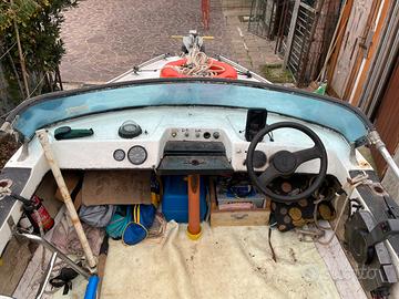o scafo lunghezza (senza motore) 4,9mt x 1,8m dotato di ecoscandaglio, capottino rimovibile, staffa per bilancino, staffa per motore di emergenza e tutta la dotazione di bordo (giubbotti salvagente, ancore, salvagente)